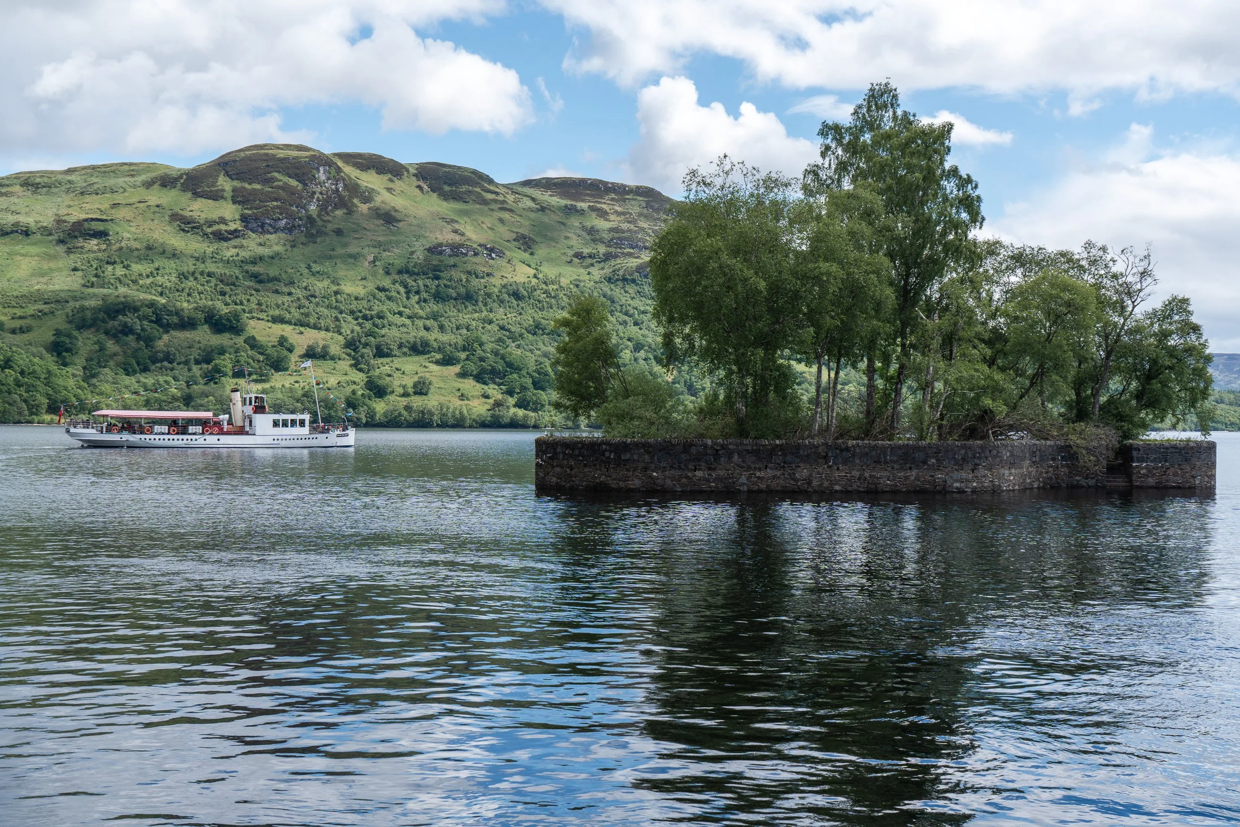 Loch Katrine is eleven miles long and more than 540 feet deep. Since 1859, it has supplied fresh water to Glasgow via a 23.5-mile gravity-fed aqueduct system opened by Queen Victoria, who arrived here by steamer for the ceremony. The water still travels fourteen hours by gravity alone to the city.